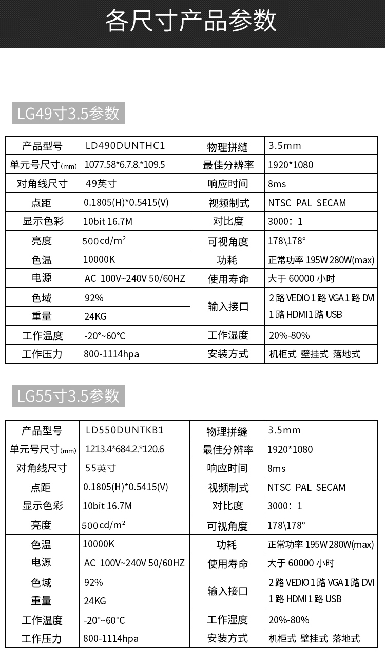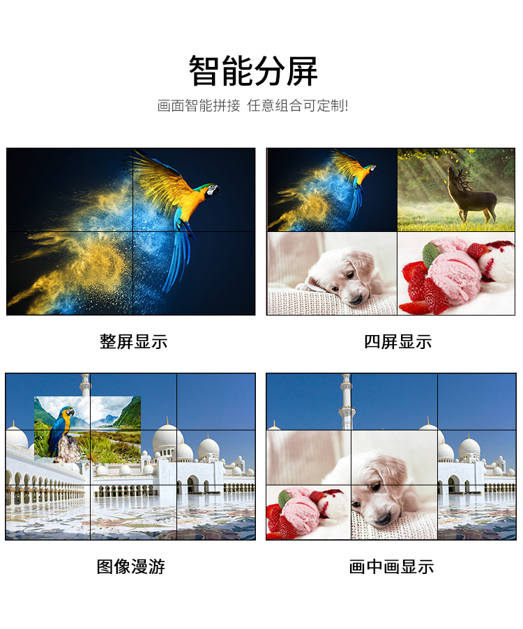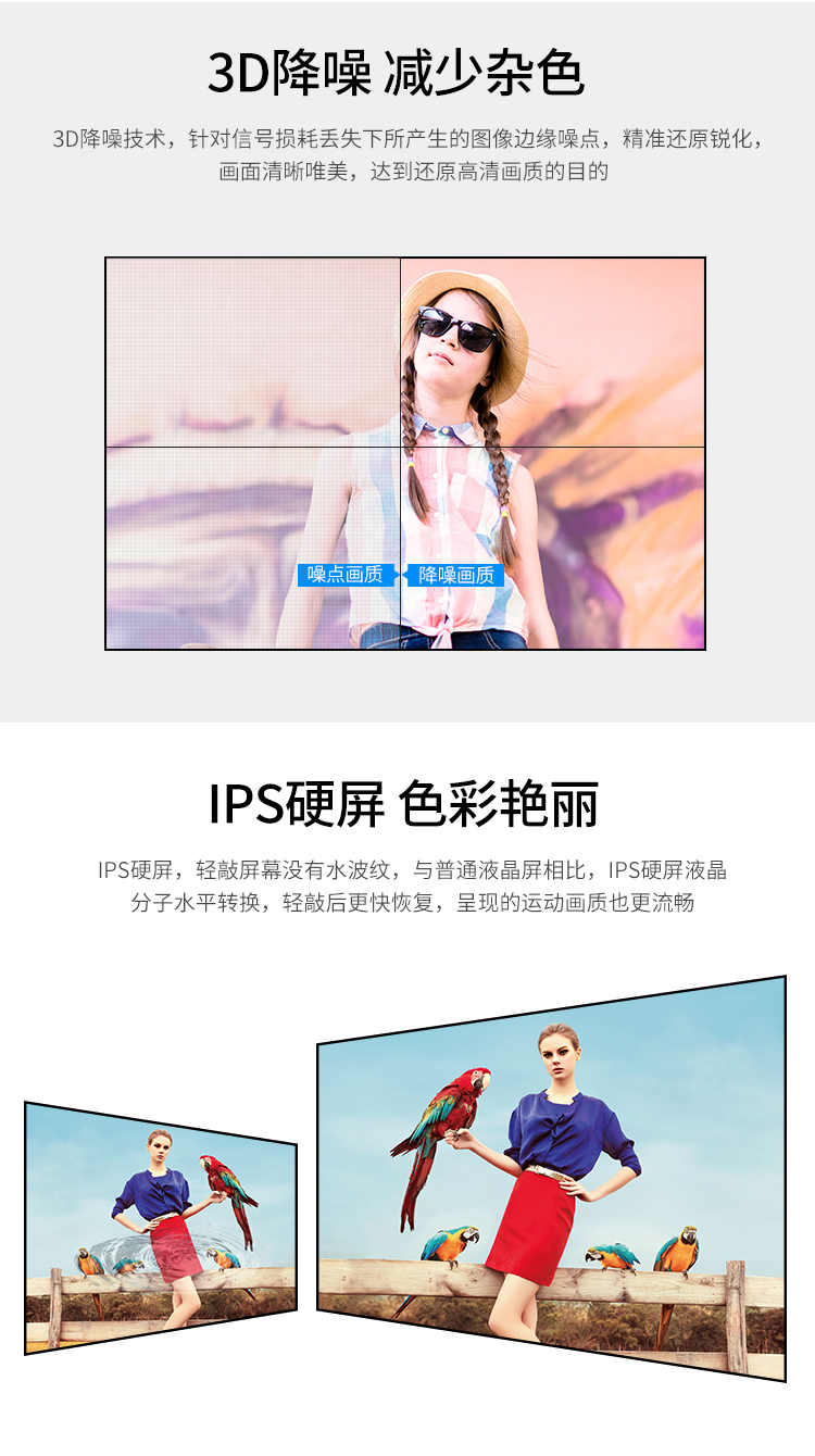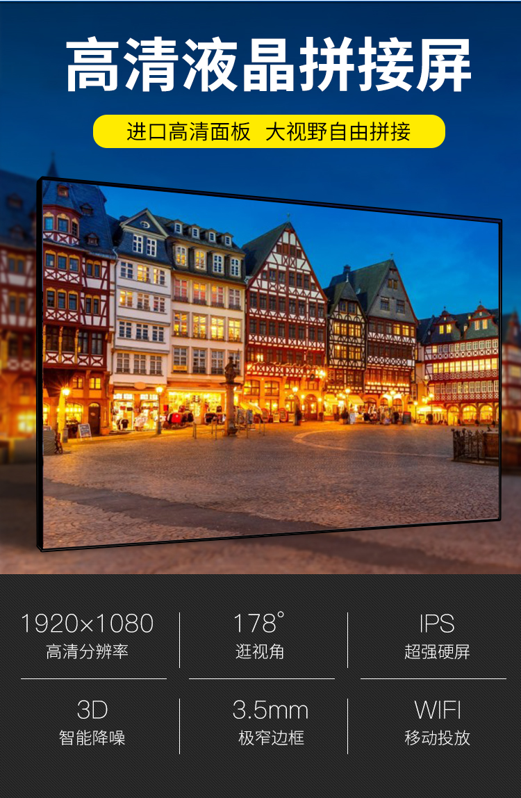 本产品主要用在视频监控、大屏广告商显、视频会议、展厅展示场景,有多种拼缝的产品,面板选用原厂原装A+三星LG京东方面板,对比度、亮度、色彩均表现优异。