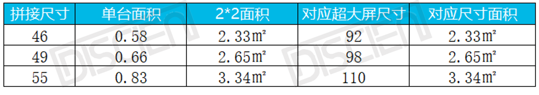 目前从拼接屏主流尺寸来看,主要为46、49、55寸,大屏对该部分市场替代主要可由三个尺寸进行替代,分别为92、98、110寸,理论上来说92、98、110寸可对任意偶数拼数(如2*2、4*2、4*4)拼接屏进行替代,但在实际应用当中,由于技术限制,超大尺寸面板的拼缝和拼接屏有较大差距,以98寸为例,目前市场98寸双拼拼缝最窄也要在1厘米以上,与拼接产品拼缝规格相去甚远,因此超大尺寸现阶段只可对2*2拼接市场进行替代。