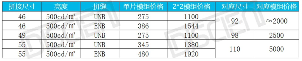 目前拼接市场仍主要以模组形式出货,从自身2*2模组价格及对应尺寸模组价格来看,无论选择UNB还是ENB,2*2拼接模组价格均便宜对应超大尺寸产品模组价格。