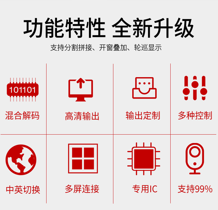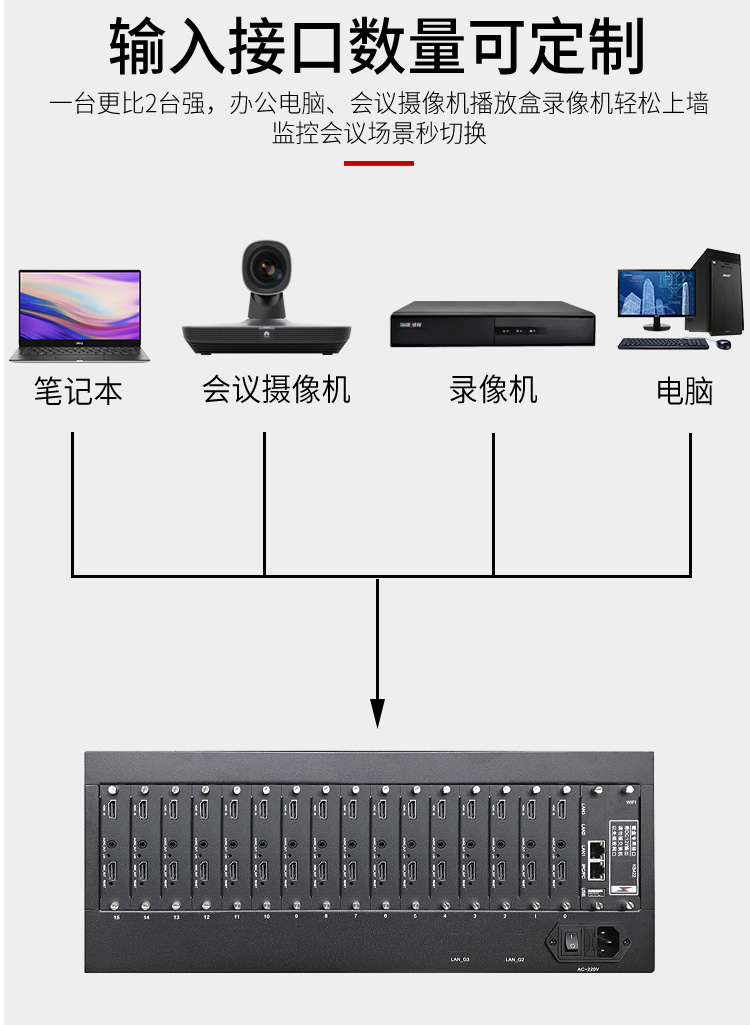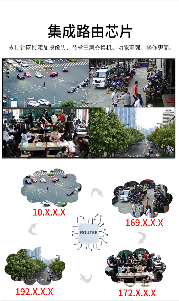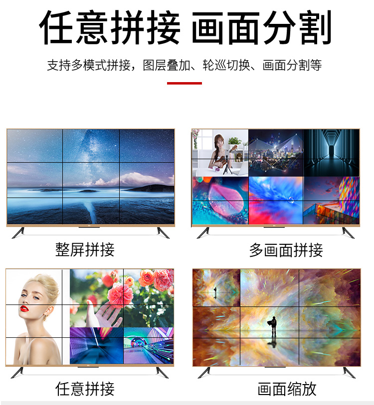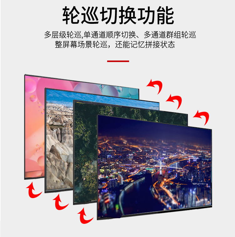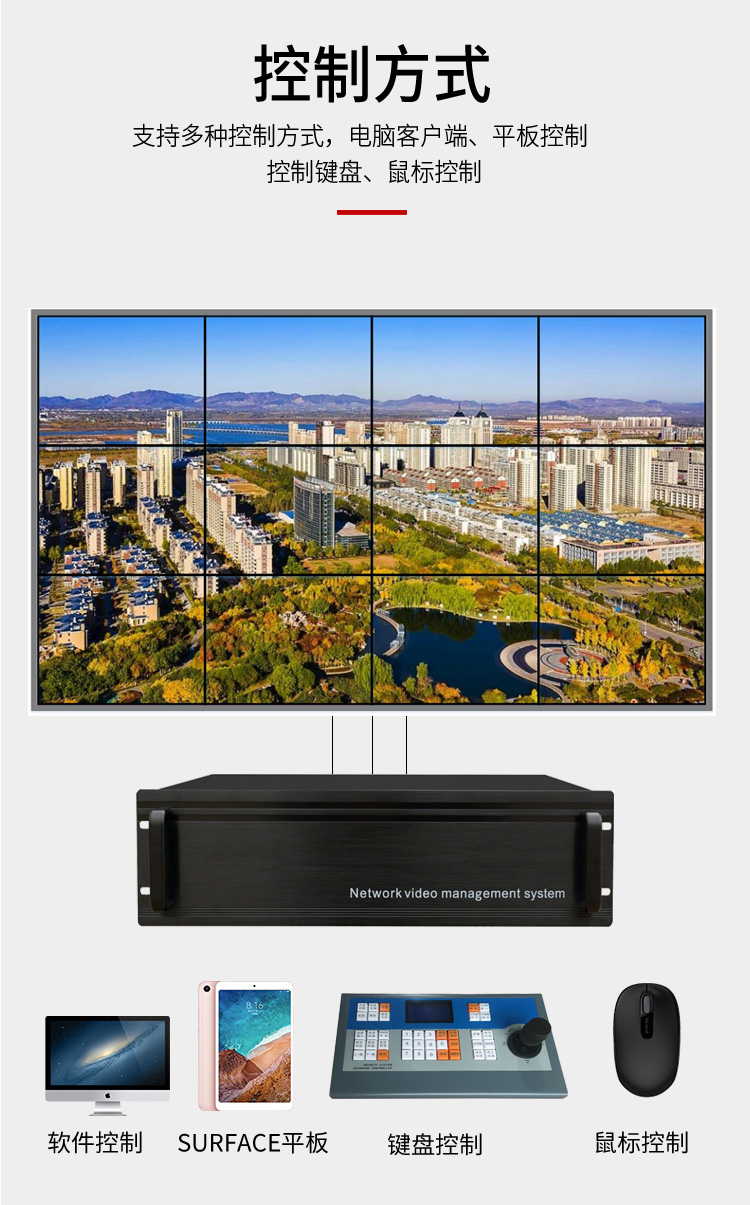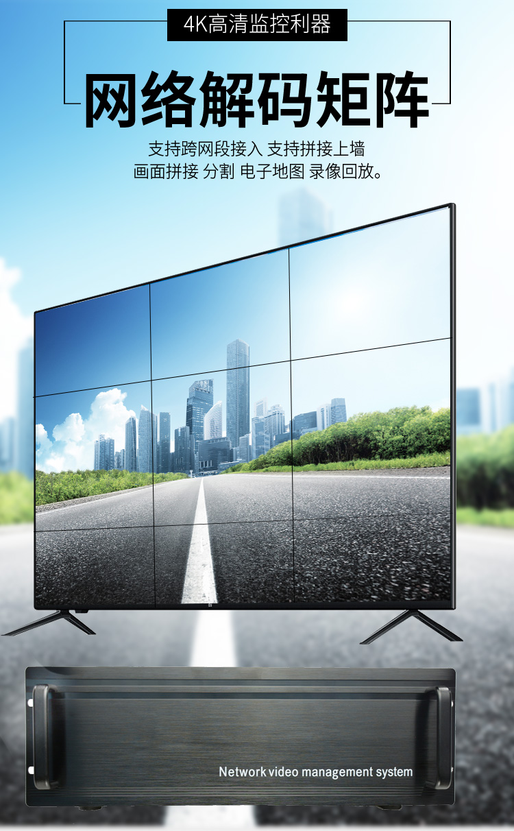本产品主要用于局域网内的监控摄像头上墙显示,可以支持网络摄像头、模拟摄像头(通过添加模拟录像机)实现视频的统一管理,拼接分割、场景轮巡、通道序切、电子地图等功能。